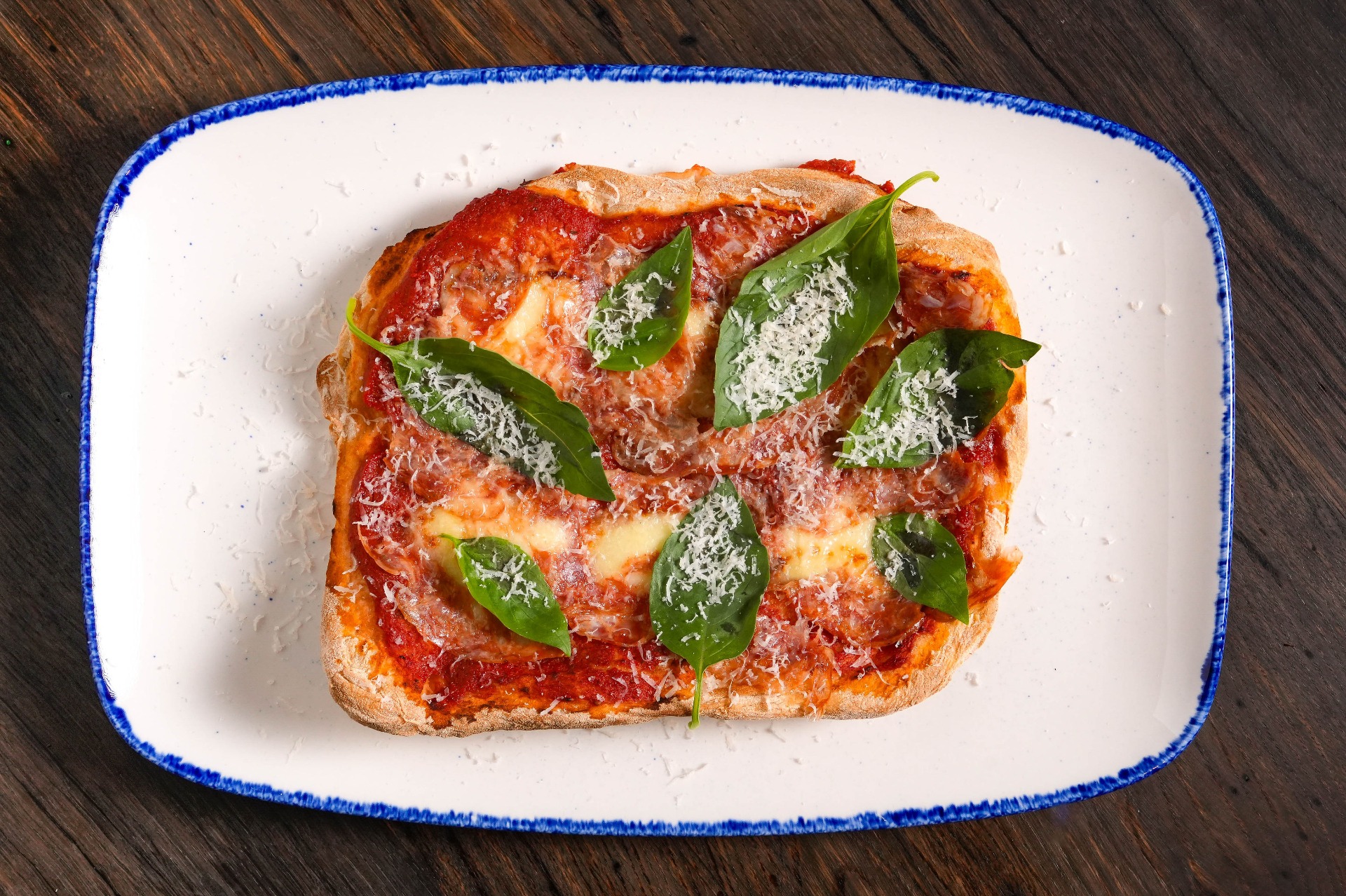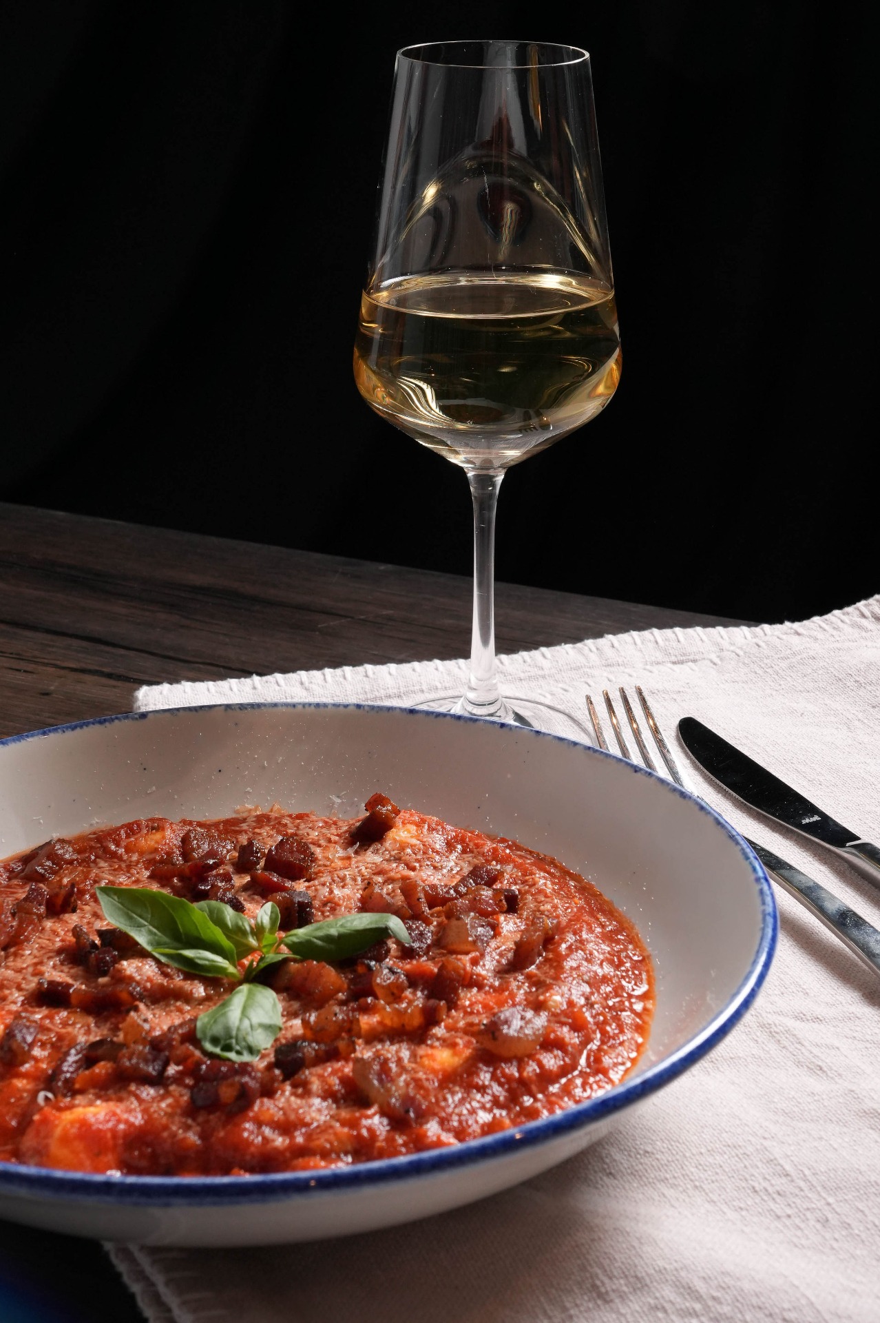 pancetta, rajčatová omáčka, Parmigiano Reggiano, bazalka
