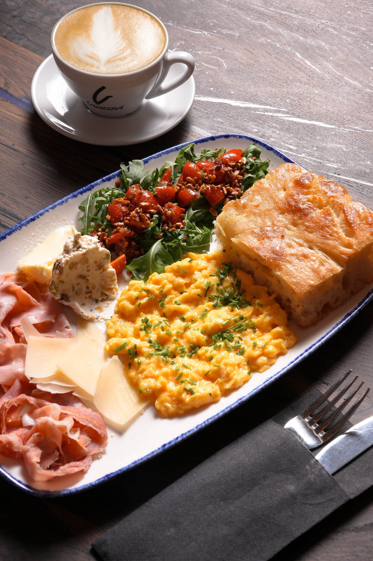 tři míchaná farmářská vejce, pažitka, krém z ricotty a pistácií, máslo, Grana Padano, mortadella, prosciutto, rukolový salát s pohankovou granolou, cherry rajčata, focaccia