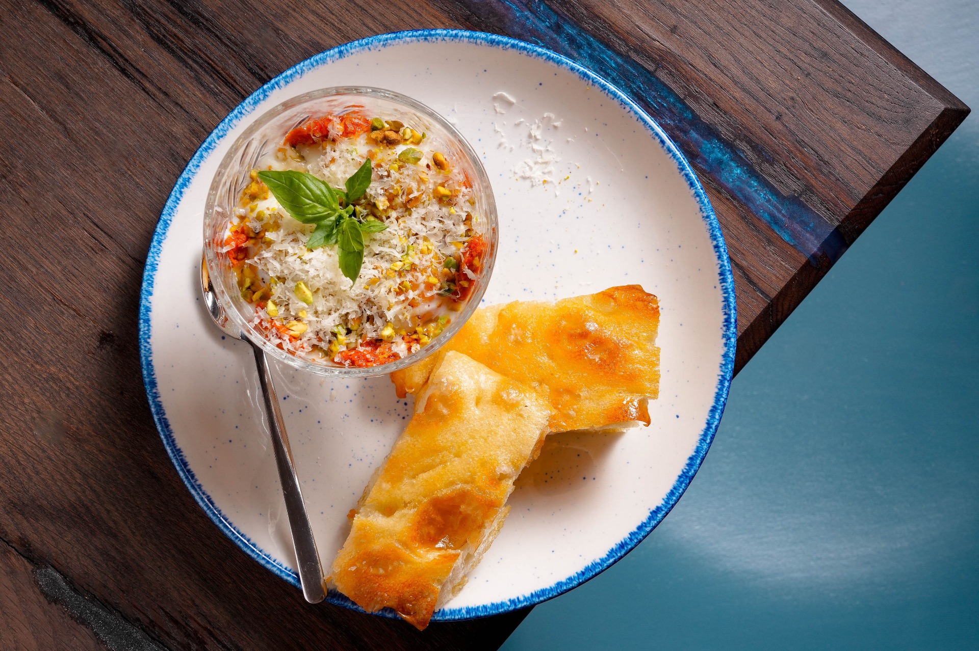 tři vejce 63, nduja, pecorino, pistácie, focaccia (možné i v nepálivé verzi)