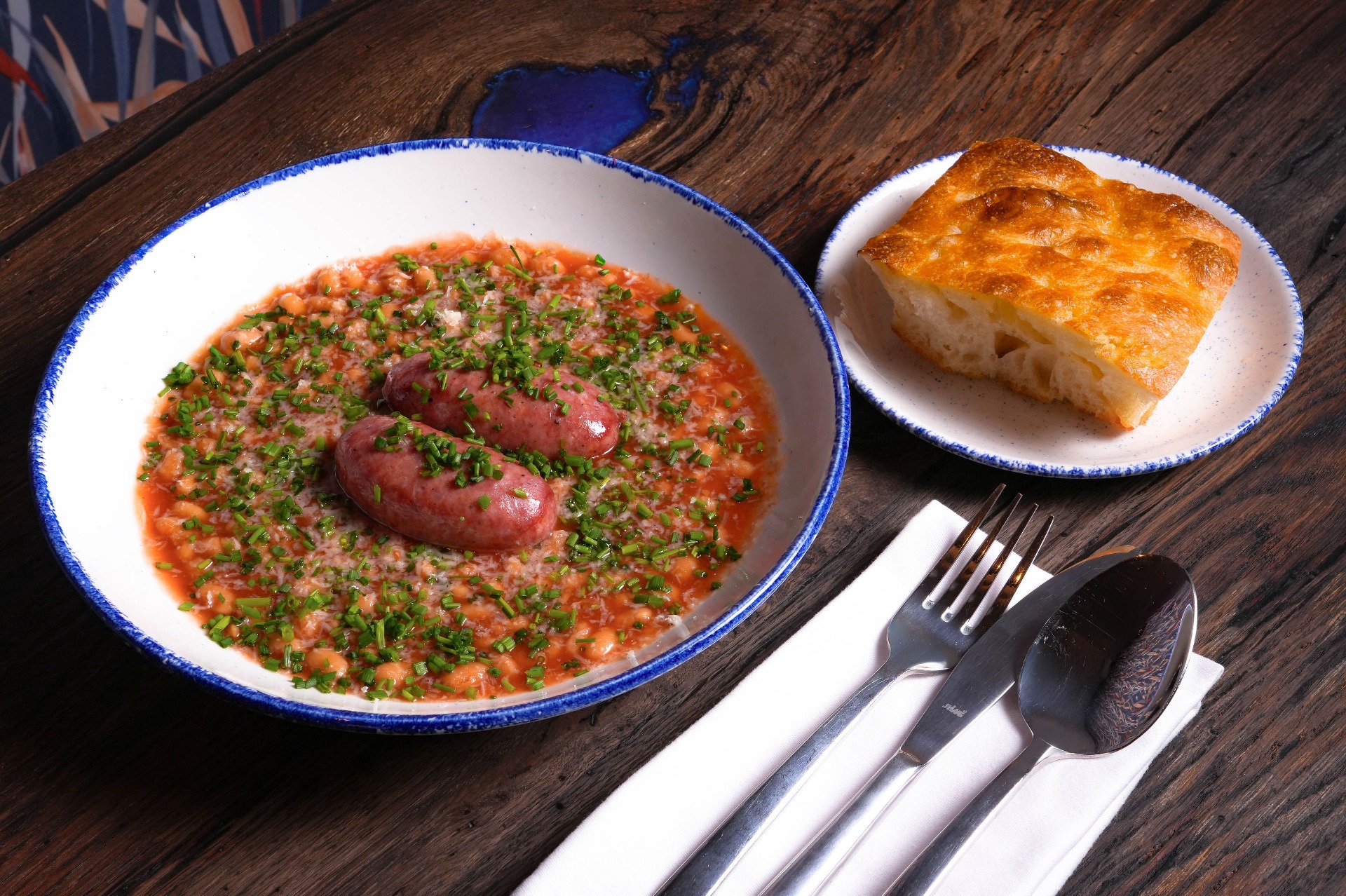 salsiccia s pečenými fazolemi v rajčatové omáčce, Grana Padano, pažitka, focaccia