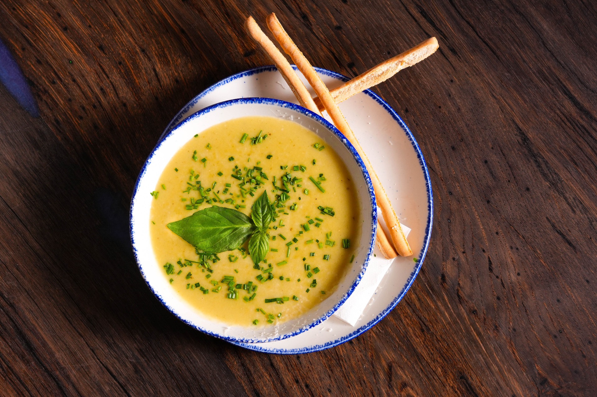 bramborovo-pórkový krém s Grana Padano, bazalkové pesto, grissini