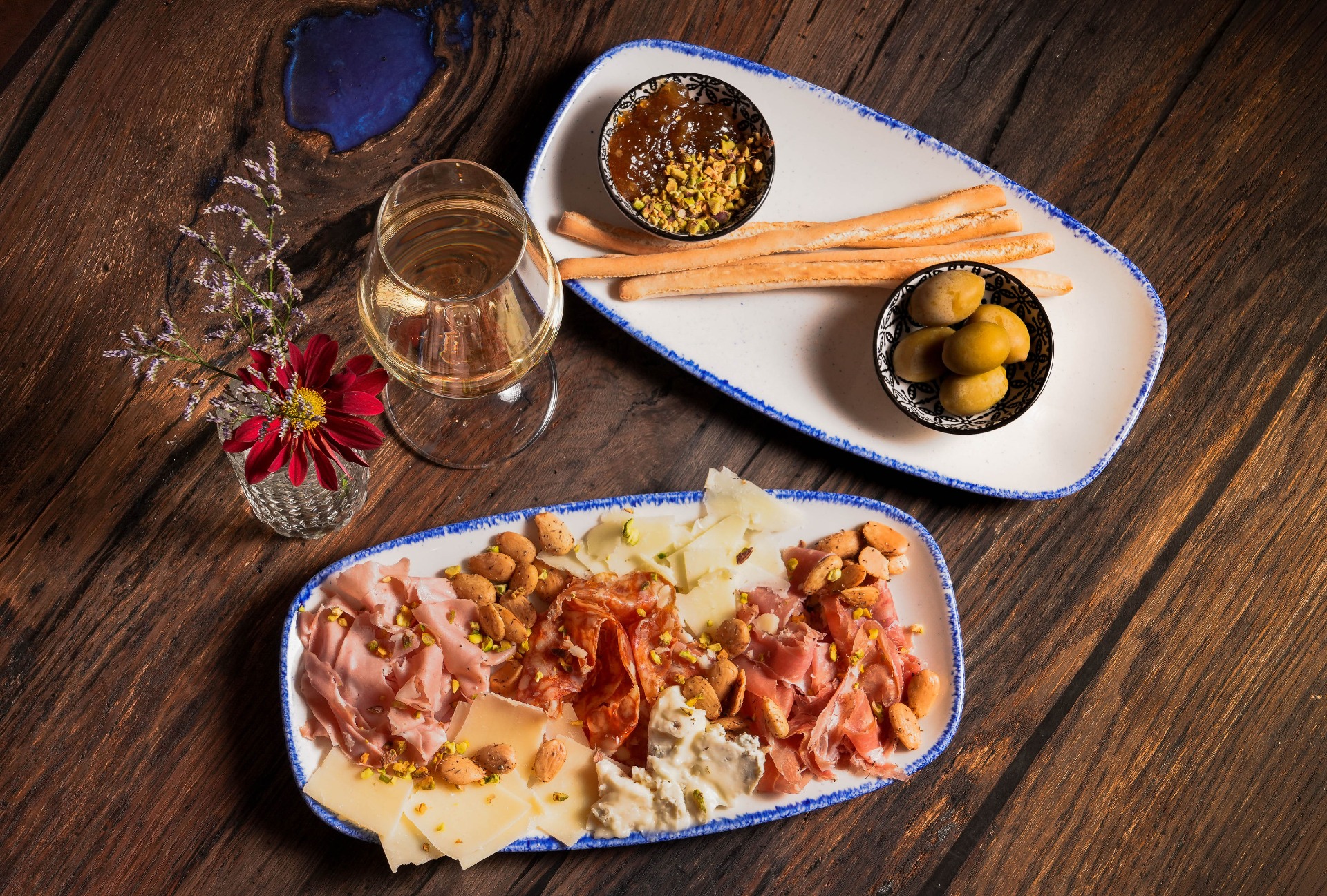 italské sýry a uzeniny, olivy, oříšky, lilková marmeláda, grissini