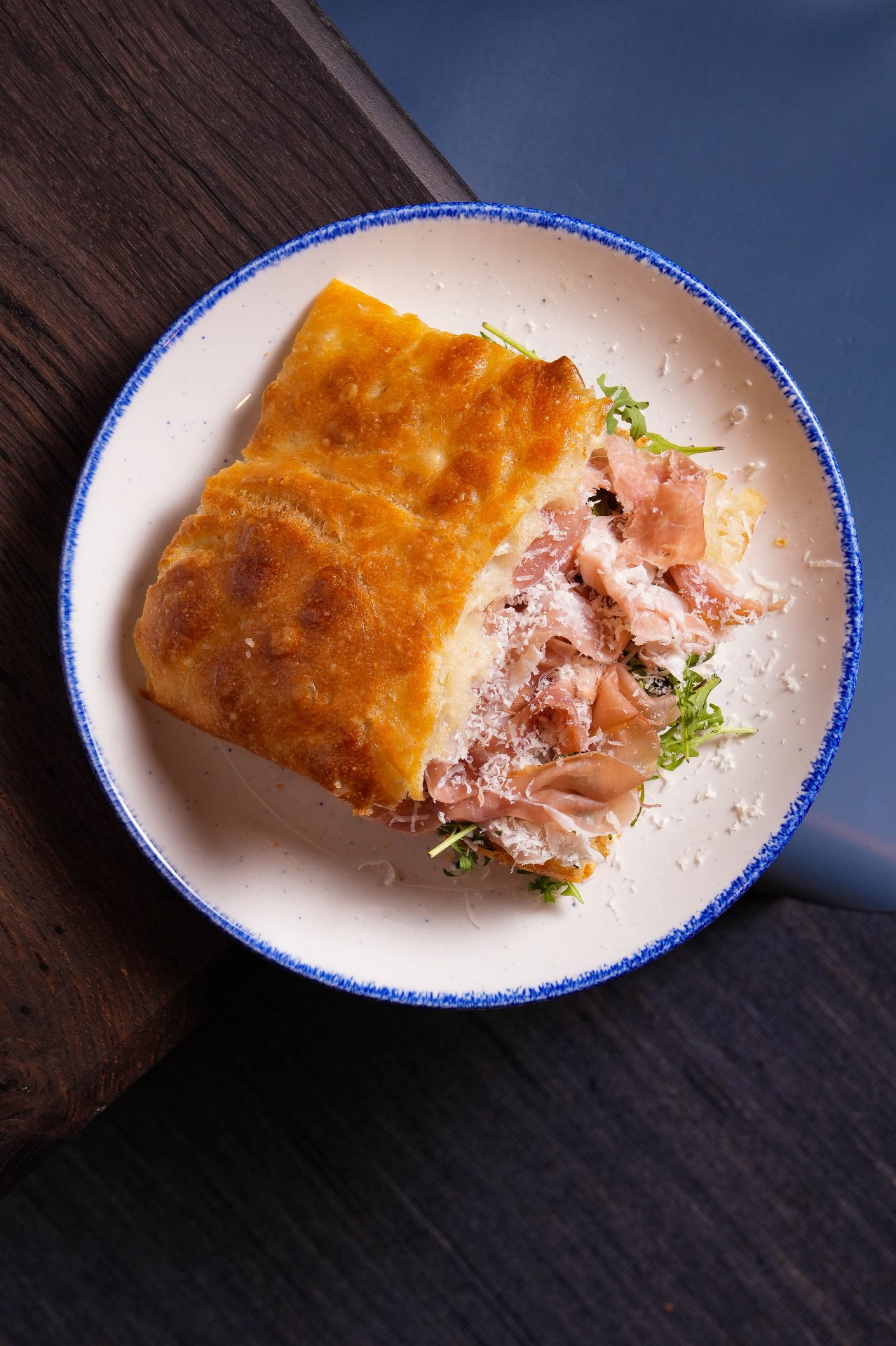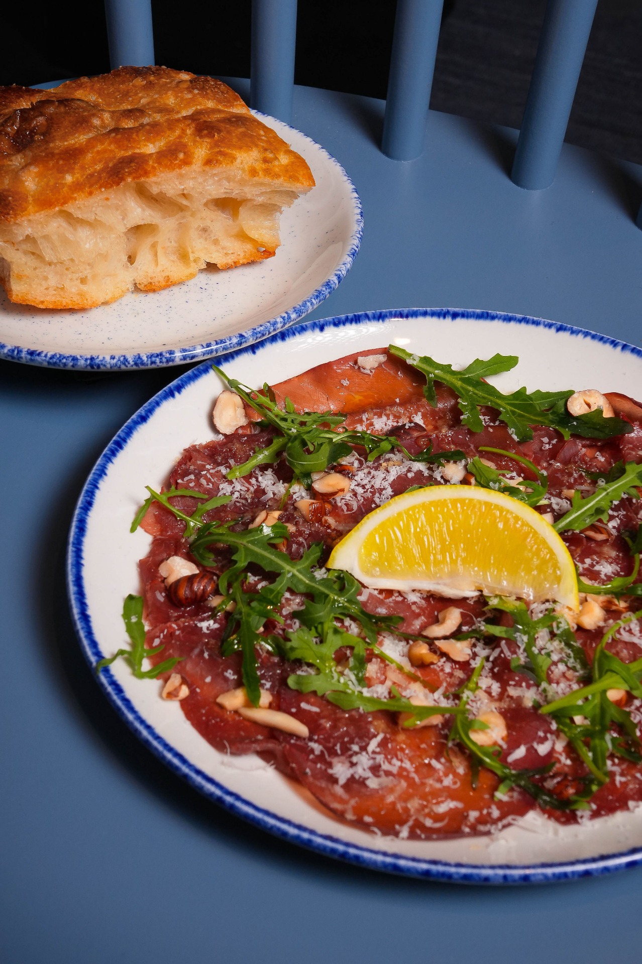 bresaola, rukola, lískové oříšky, Parmigiano Reggiano, olivový olej, citron, focaccia